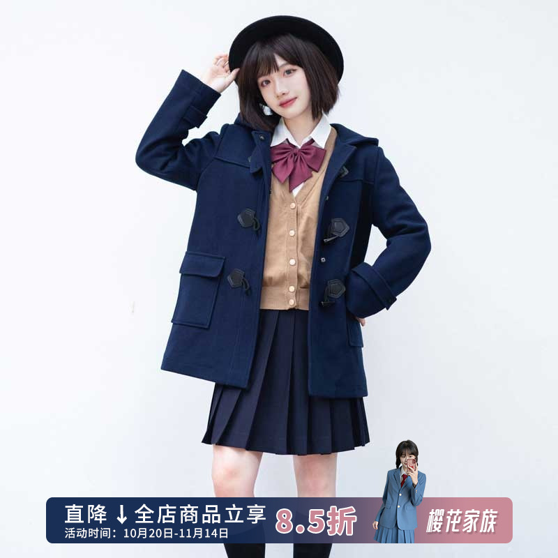 樱花家族jk制服 加棉加厚毛呢大衣 牛角扣中长款小个子外套女秋冬