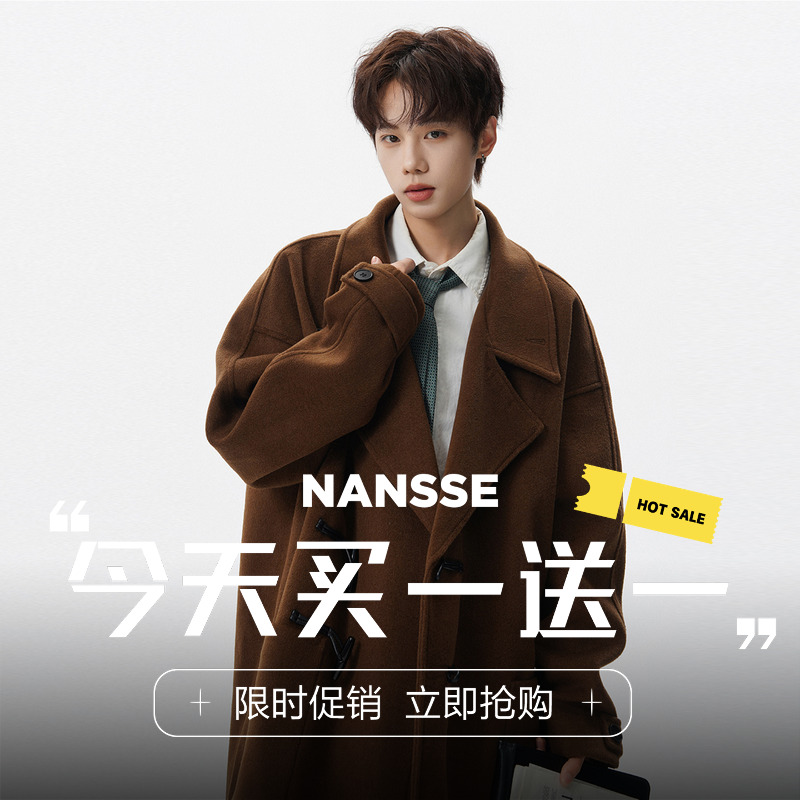 美式牛角扣中长款毛呢大衣男秋冬新款潮牌高级感宽松休闲翻领外套