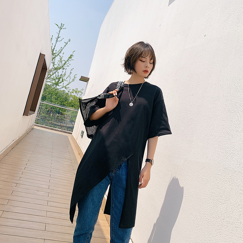 中长款t恤女夏纯棉五分袖韩版宽松显瘦不规则下摆开叉上衣打底衫