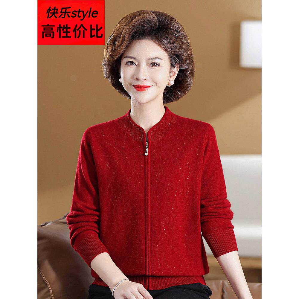 艾靓依妈妈装秋冬装满钻羊毛开衫中老年人女装拉链口袋款毛衣外套