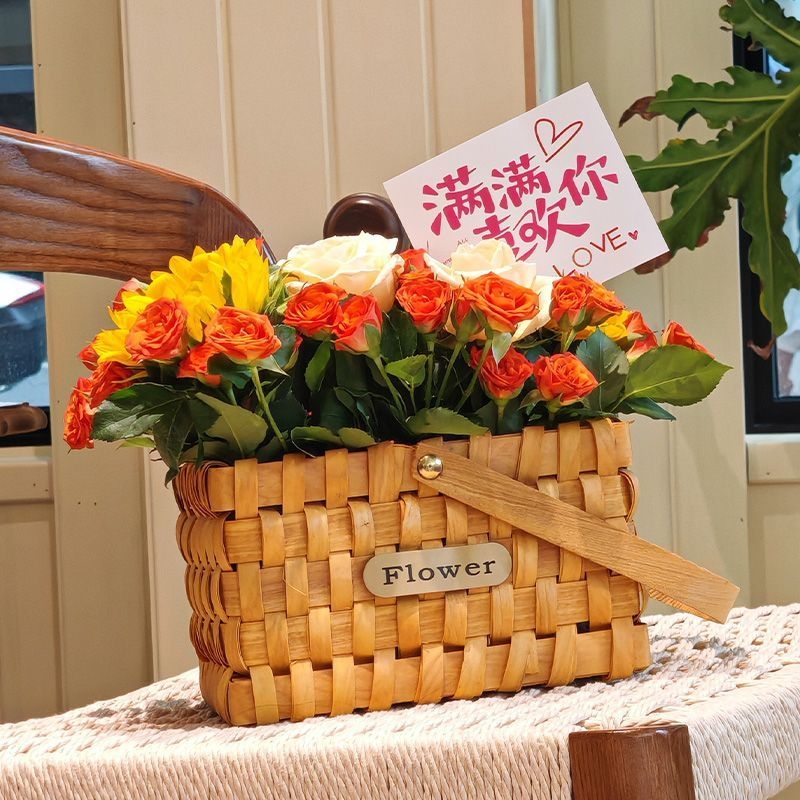 七夕节鲜花篮送女友手提花篮木编田园插花手工花束编织篮花篮批发