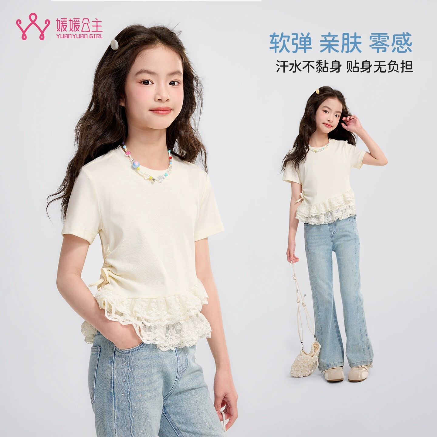 媛媛公主女童短袖T恤夏2026新款儿童透气花边拼接圆领短袖小女孩