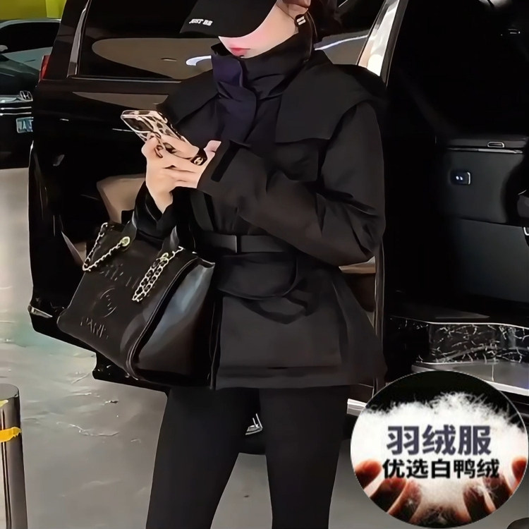 2025新款女装冬季修身收腰短款羽绒服女小个子黑色大翻领鸭绒外套