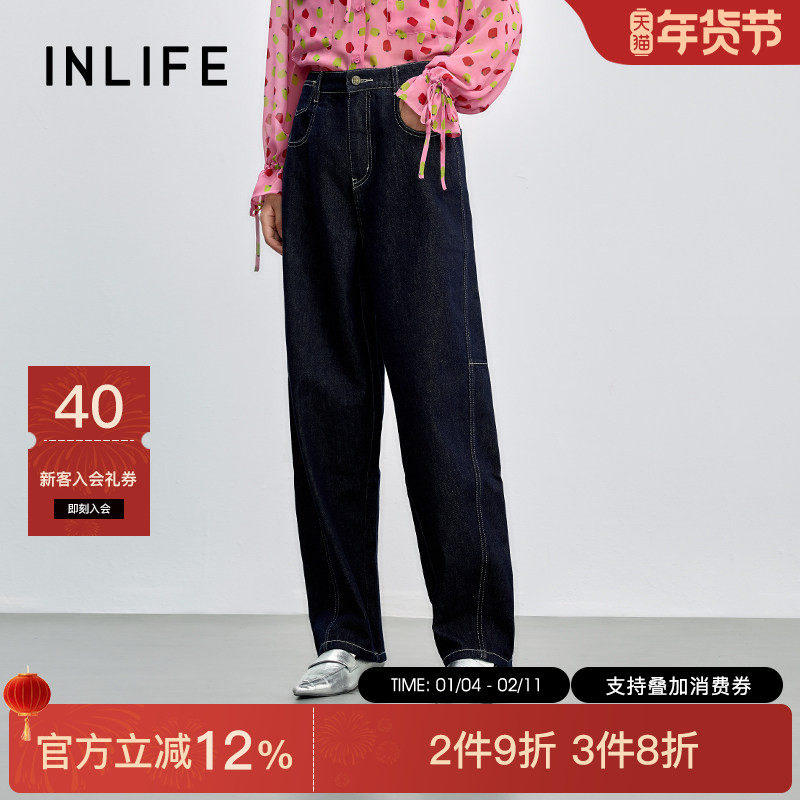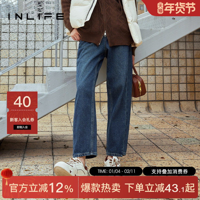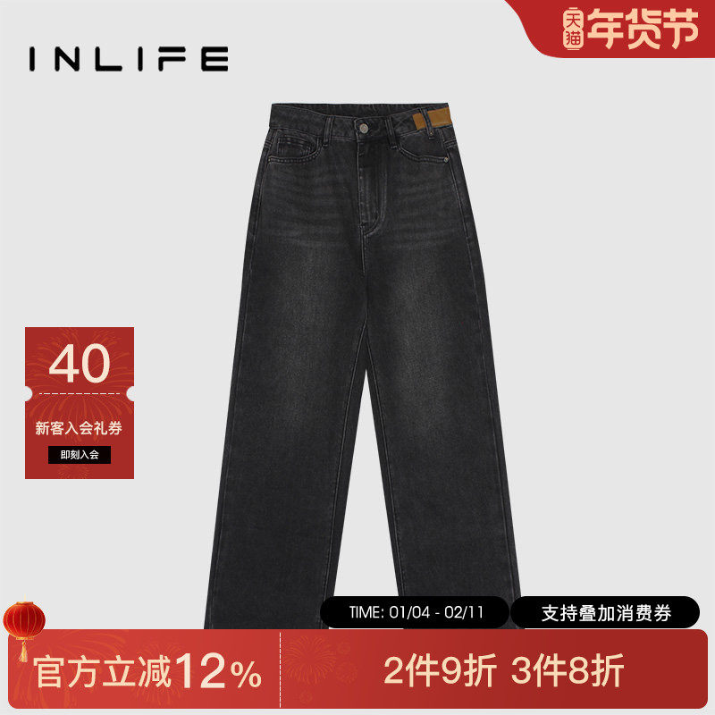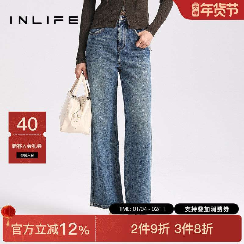 伊纳芙美式复古高腰牛仔裤女2025冬新款时尚宽松直筒裤休闲阔腿裤