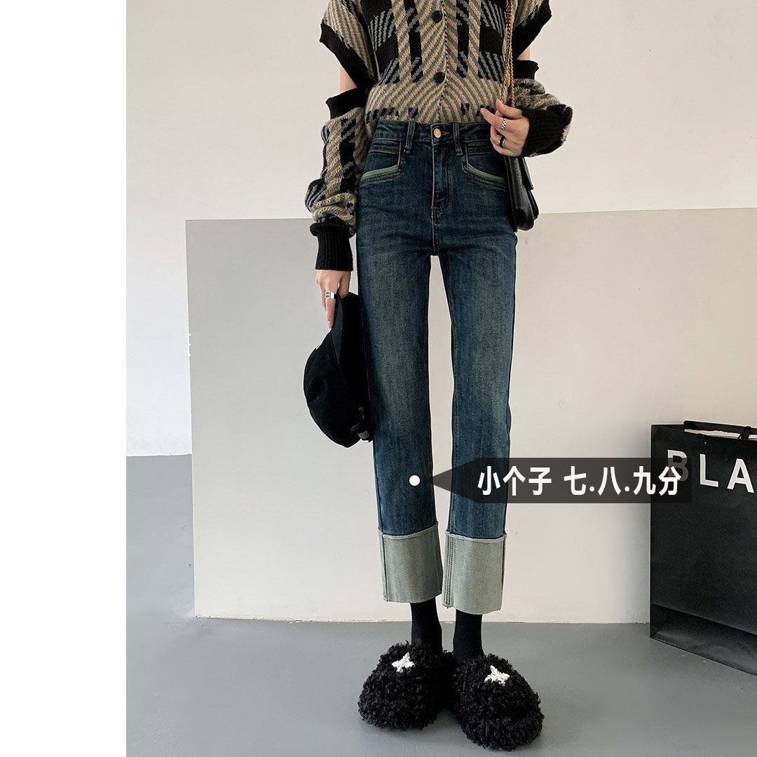 曹大曼 时髦显腿直修身弹力显瘦加绒高腰复古微喇叭九分牛仔裤女