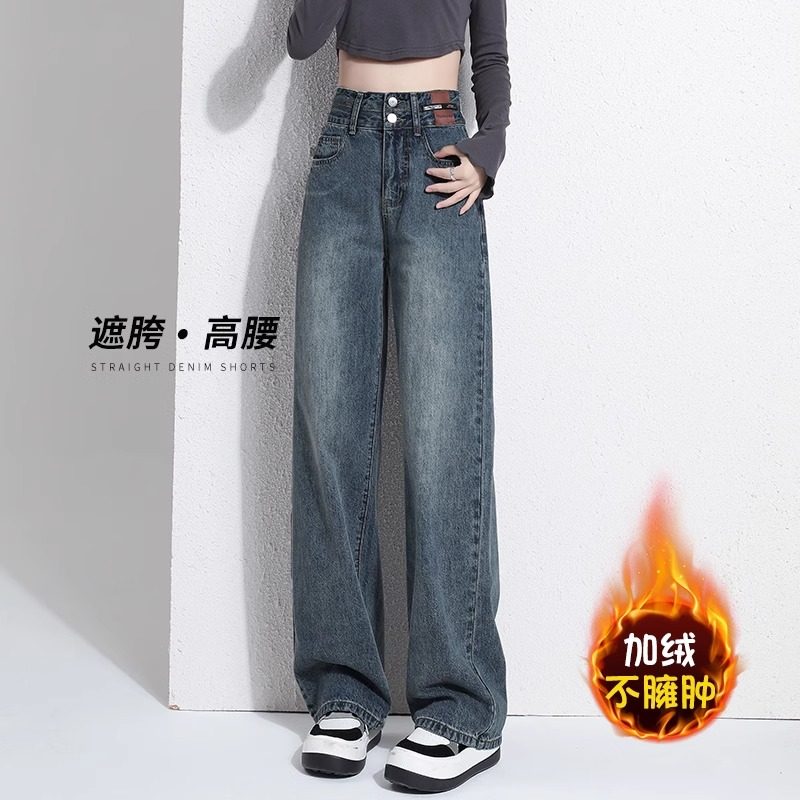 复古蓝阔腿牛仔裤女冬季加绒大码胖mm宽松显瘦梨形身材高腰直筒裤