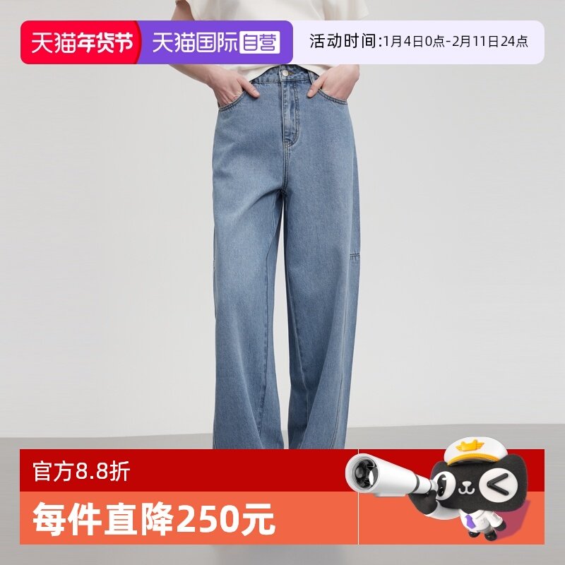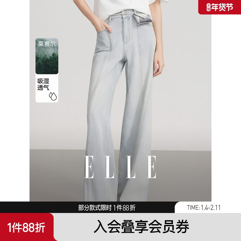 【商场同款】ELLE浅蓝色复古高腰牛仔裤女2025夏季新款显瘦阔腿裤