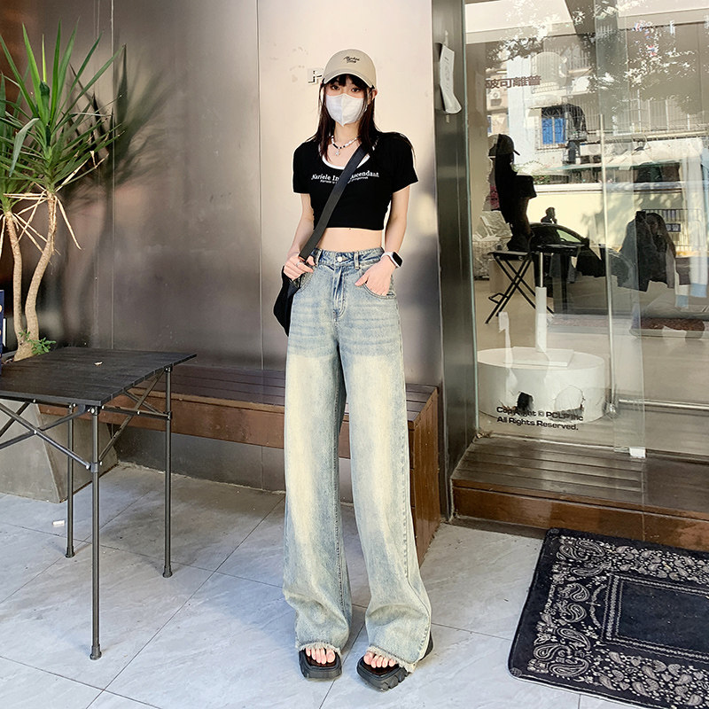 150小个子复古高腰牛仔裤女秋季新款百搭阔腿宽松显瘦直筒拖地裤