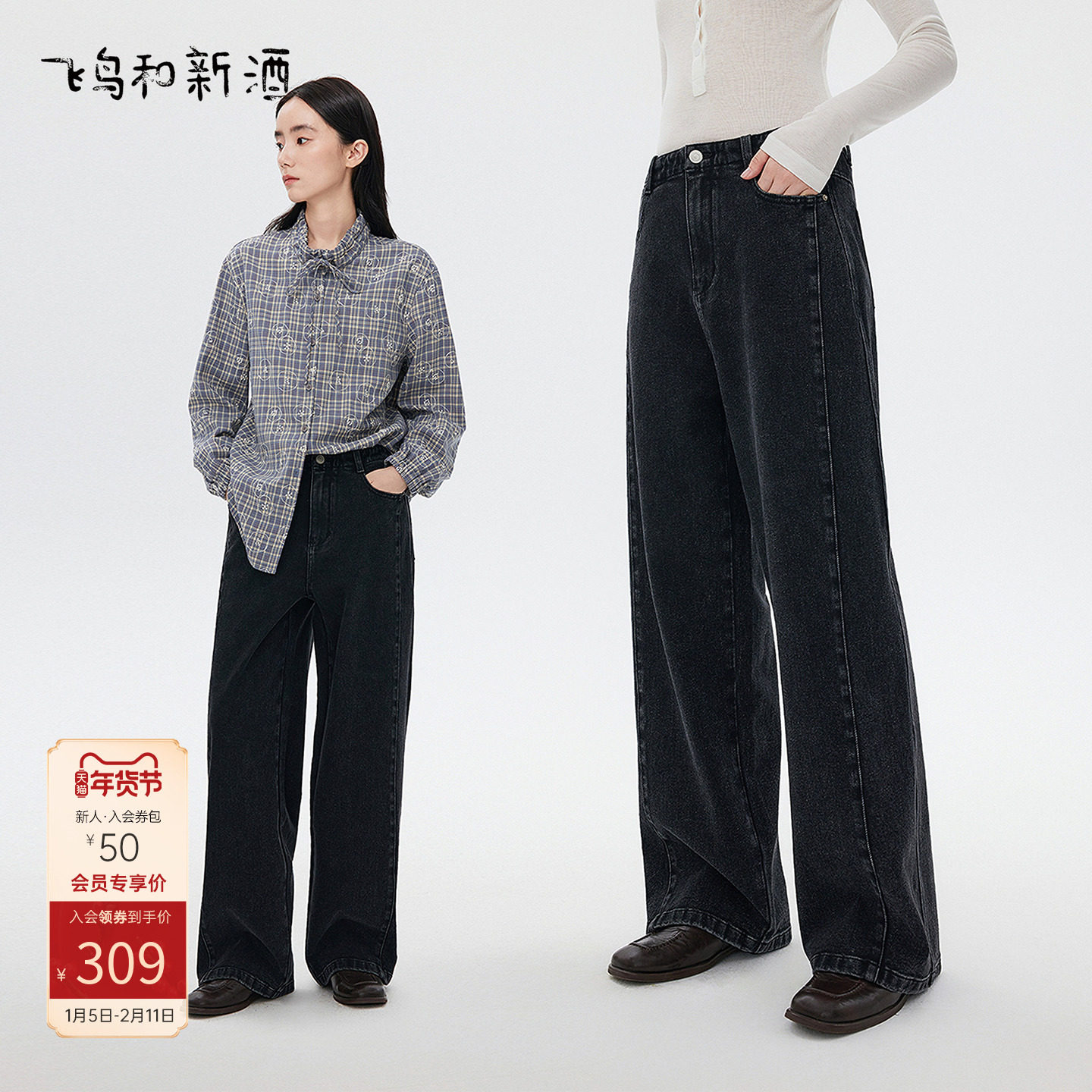 飞鸟和新酒复古高腰牛仔裤女2025秋季新款时尚黑色显瘦直筒裤
