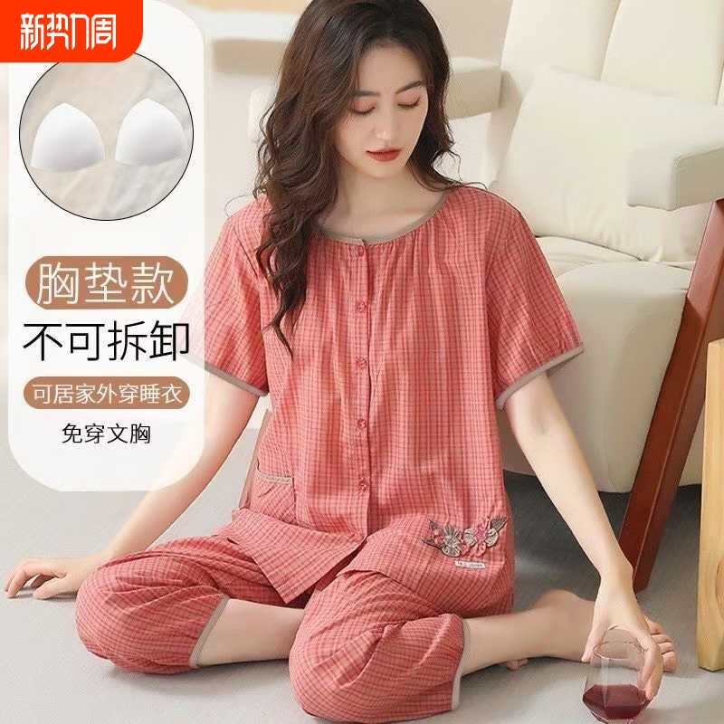 睡衣女士带胸垫夏季纯棉短袖长裤可外穿闺蜜家居服两件套装家居服