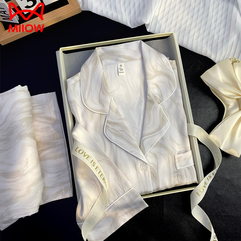 猫人冰丝睡衣女夏季短袖短裤长裤三件套甜美送闺蜜生日礼物礼盒装