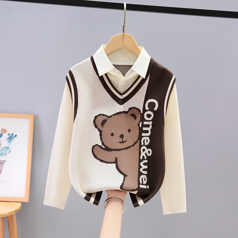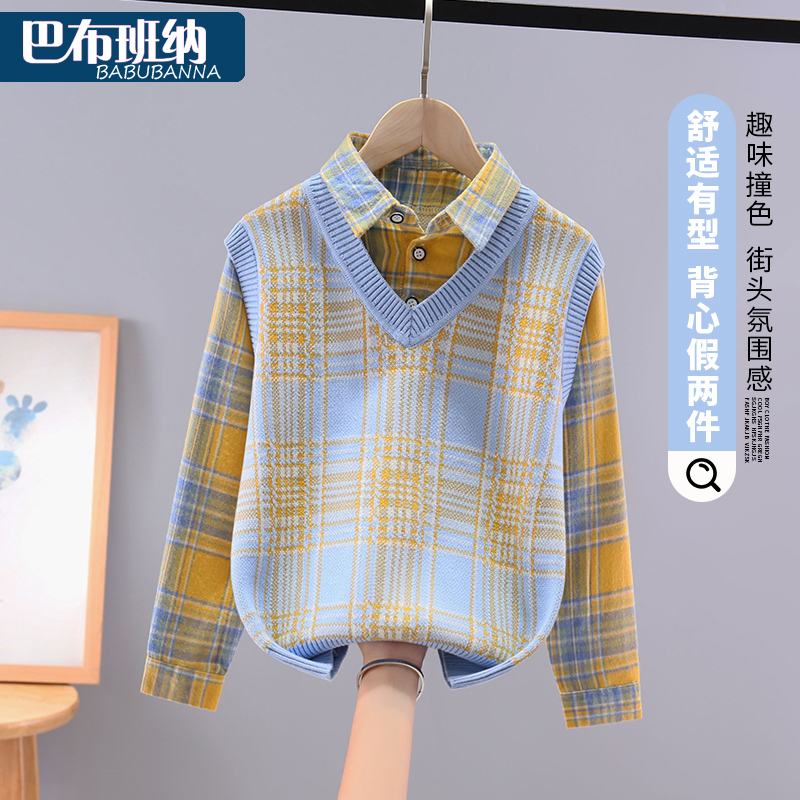 男童毛衣假两件春秋2025新款儿童韩版洋气背心中大童针织衫纯棉潮