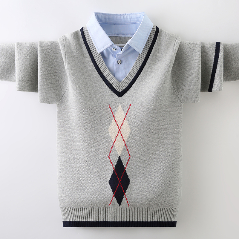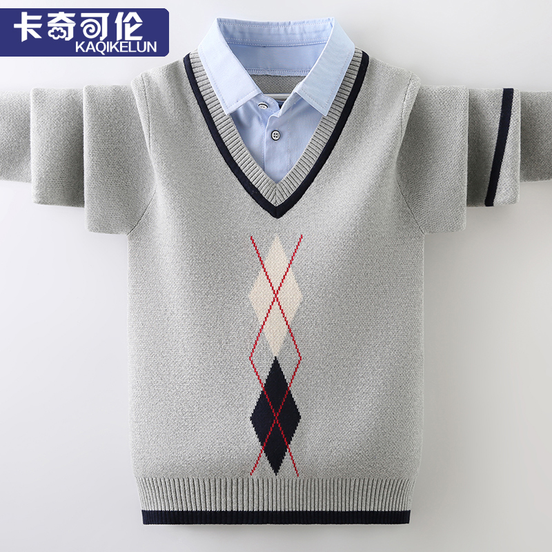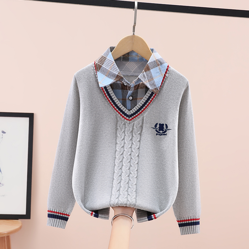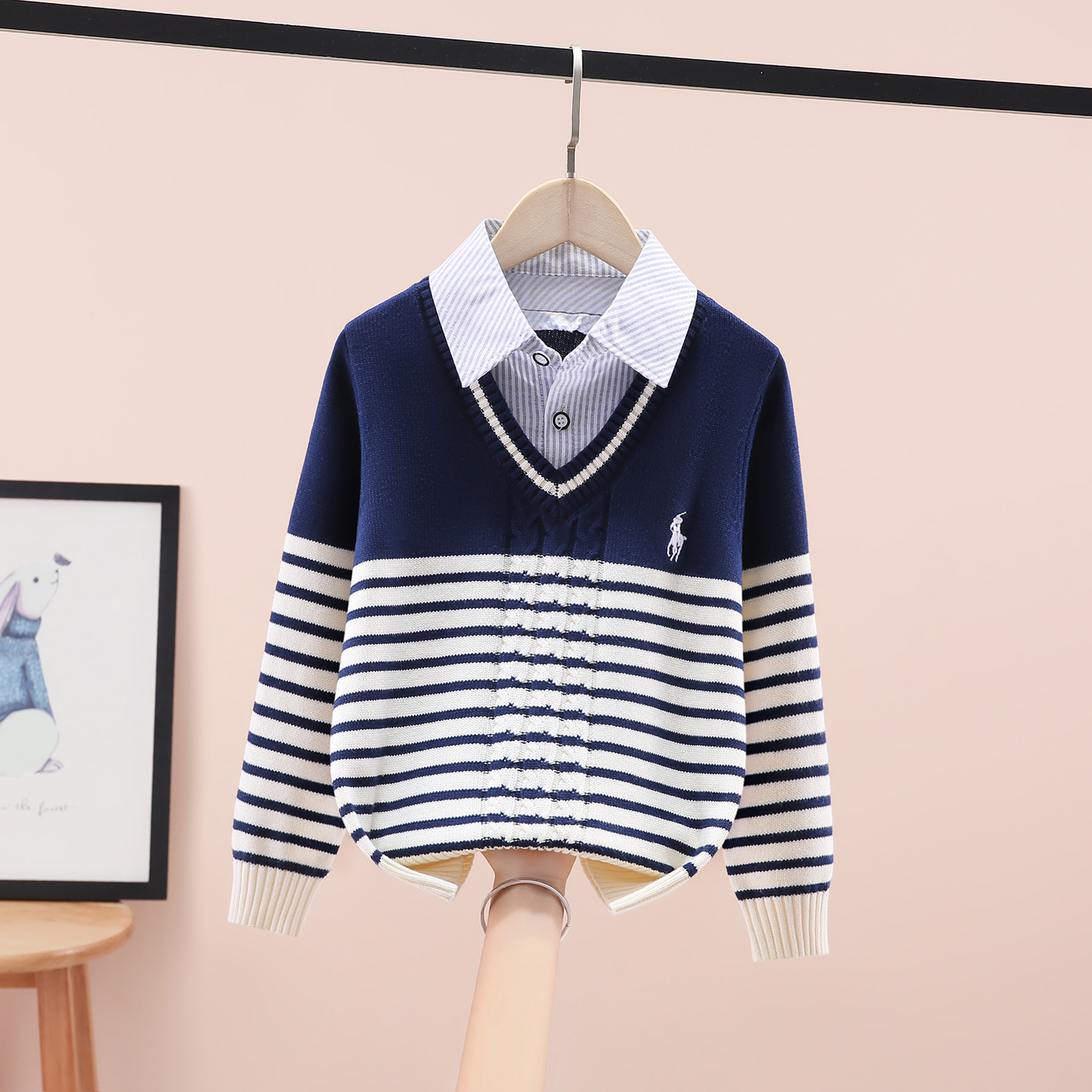 男童毛衣假两件衬衫领中大童套头针织衫儿童洋气打底衫秋冬新款潮