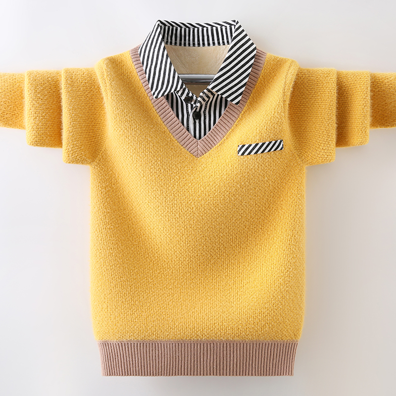 男童毛衣假两件秋冬新款加绒加厚针织衫中大童男孩衬衫领纯棉线衣
