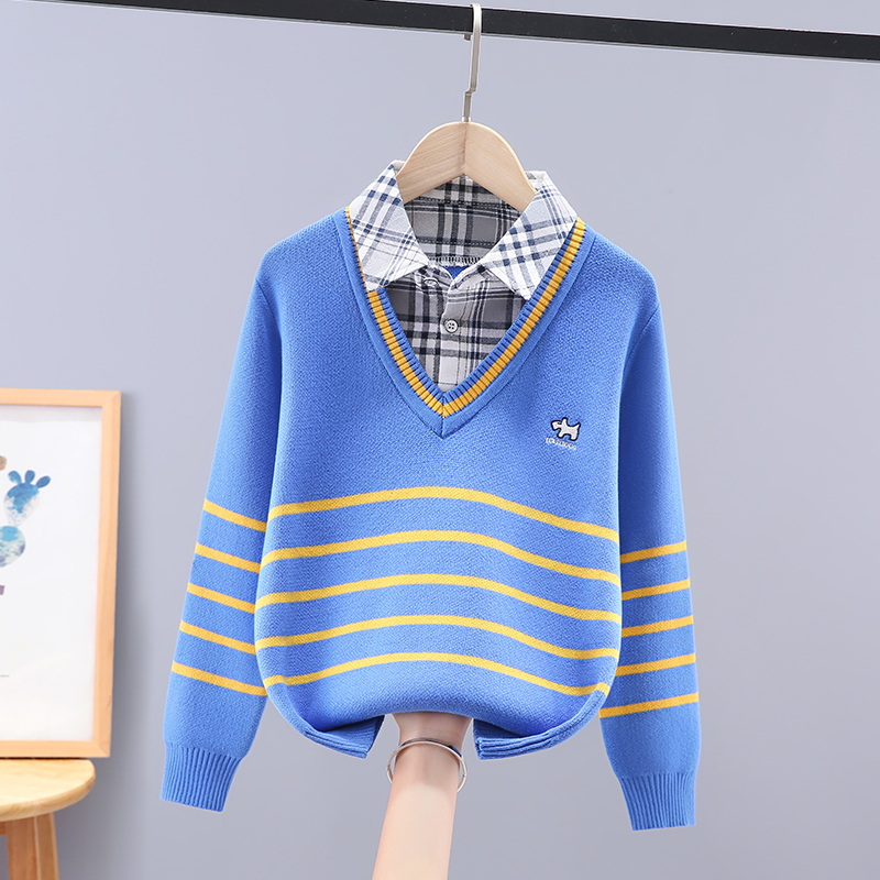 男童毛衣假两件春秋装纯棉儿童针织衫外套衬衫领全棉中大童装韩版
