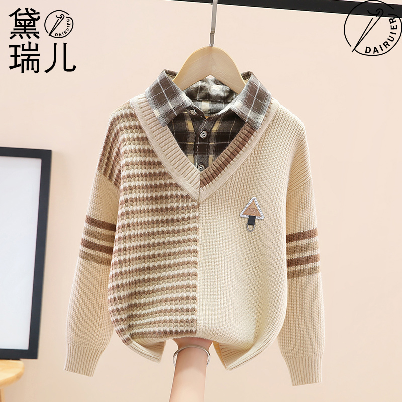 男童毛衣假两件2025春秋薄款儿童纯棉针织衫加绒中大童男孩衬衫领