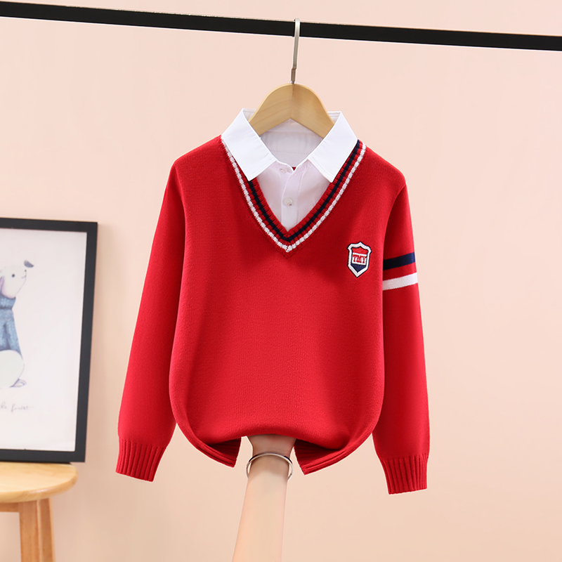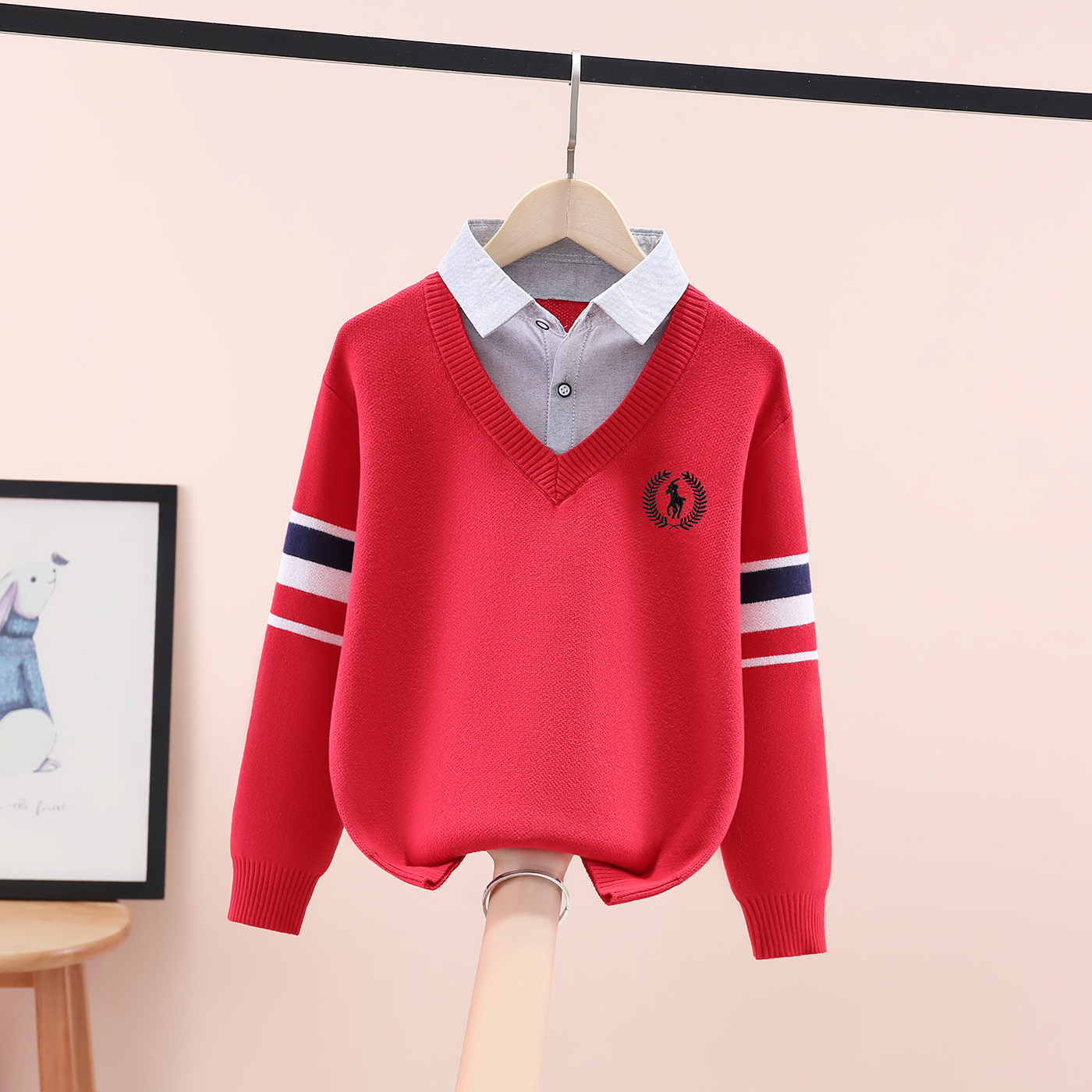 男童毛衣假两件纯棉2025秋冬新款中大童衬衫领针织衫儿童红色洋气