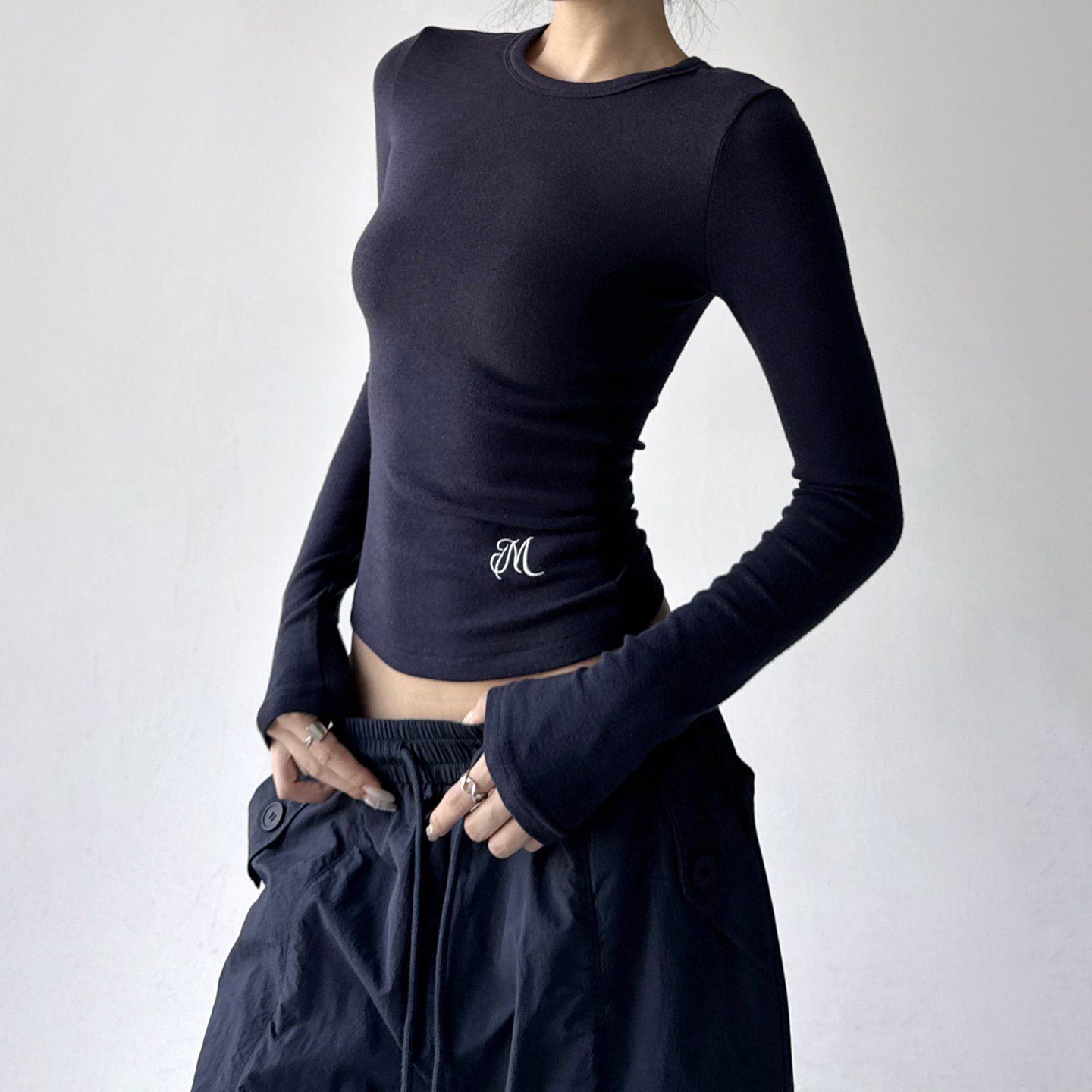 NEVA HU黑色长袖紧身t恤打底衫女韩版设计感小众修身显瘦短款上衣