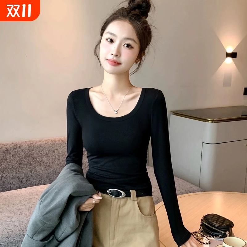 纯欲低领紧身打底衫女长袖t恤薄款内搭修身显瘦纯色百搭u领上衣潮