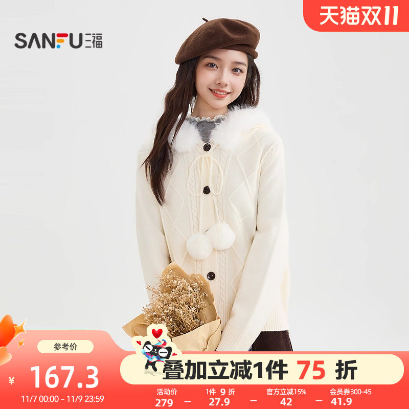 三福毛衣开衫2025新款冬季韩系可拆毛领保暖宽松白色外套上衣女装