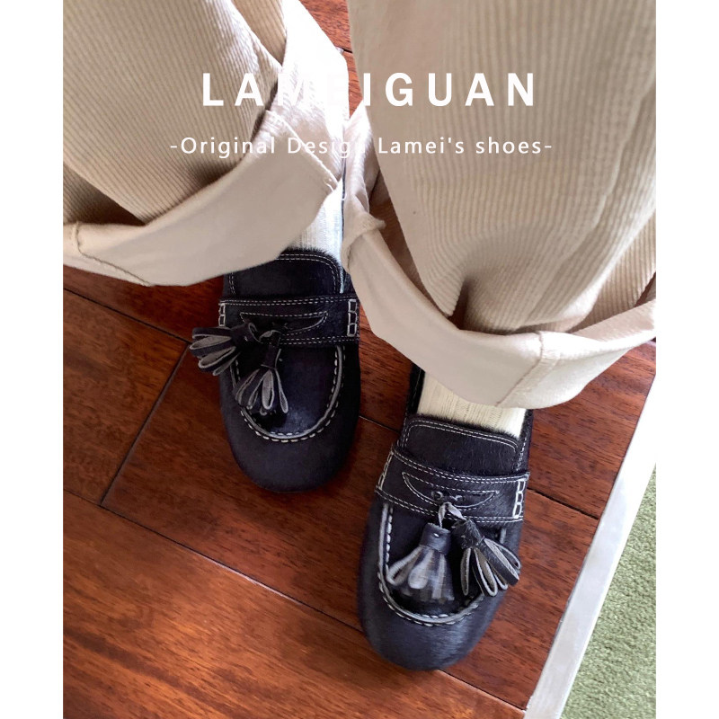 马毛流苏深口平底乐福鞋女2026新款复古蓝色一脚蹬圆头小皮鞋单鞋