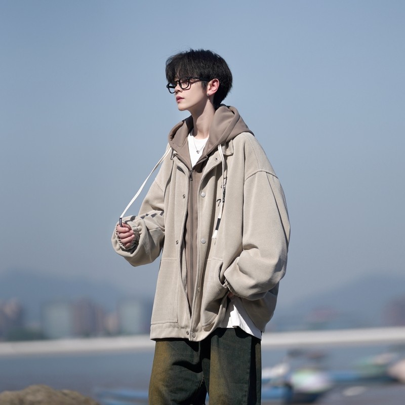 啄木鸟夹克2025秋冬季新款假两件外套男胖子大码宽松加棉服连帽衫