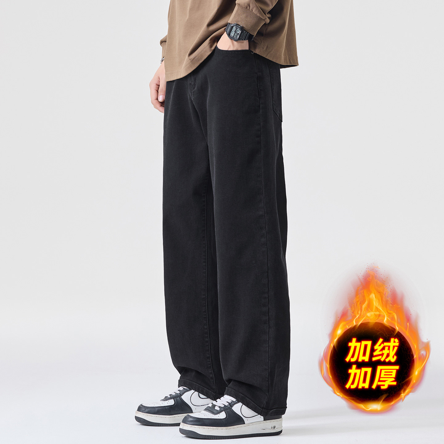 秋冬加绒大码直筒牛仔裤男胖子加肥加大码弹力显瘦粗腿宽松阔腿裤