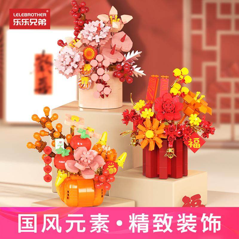 新春系列花篮盆栽积木永生花男女孩拼装玩具桔子树摆件儿童节礼物
