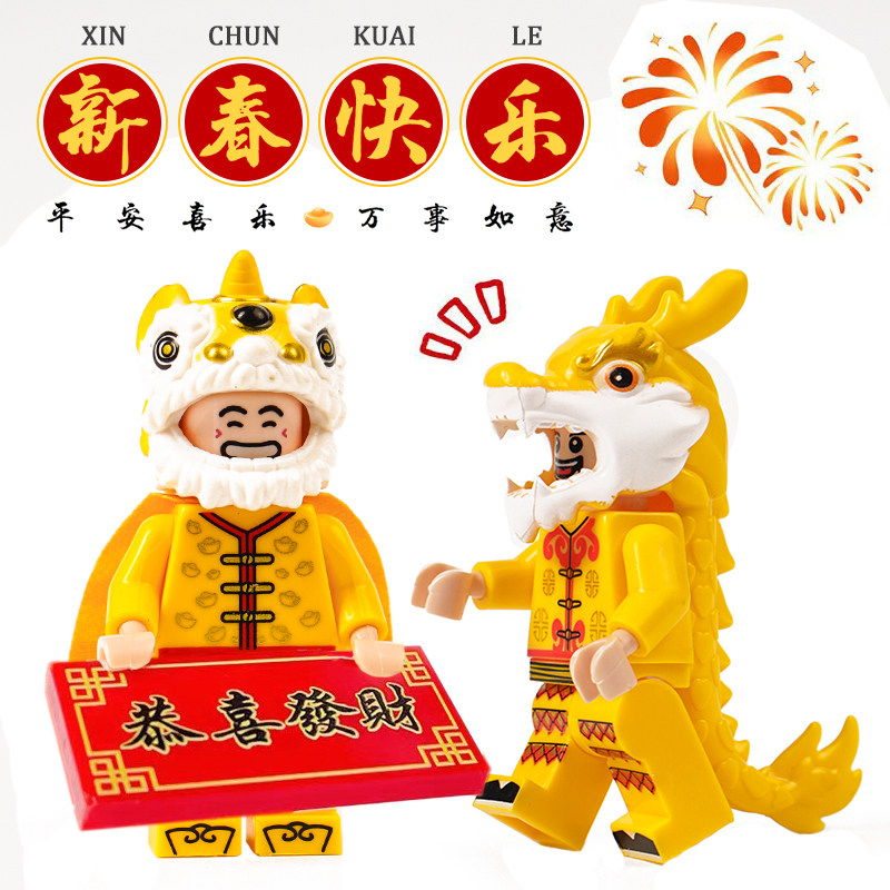 2025蛇年新品春节舞狮中国风积木新年人仔男女孩拼装玩具礼物公仔
