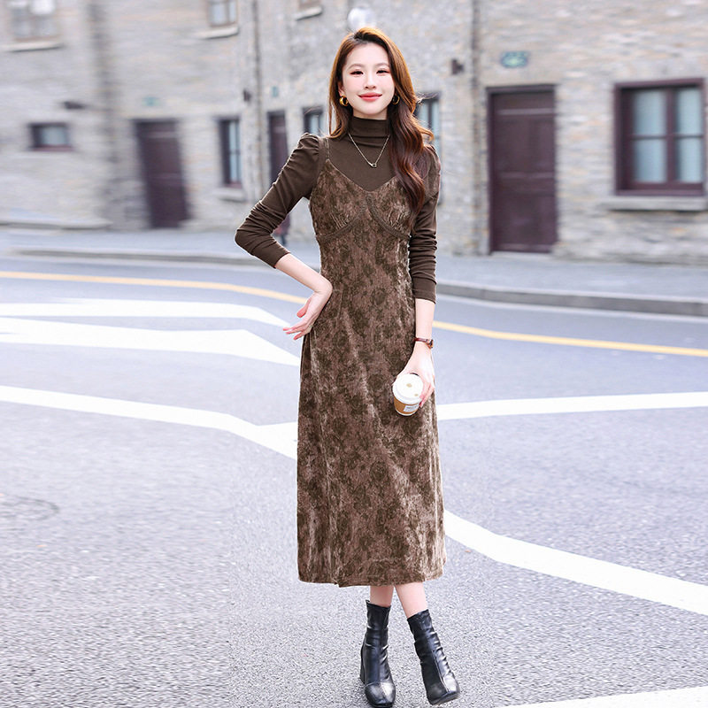 2025新款秋冬装女时尚气质优雅打底衫吊带修身显瘦连衣裙两件套装