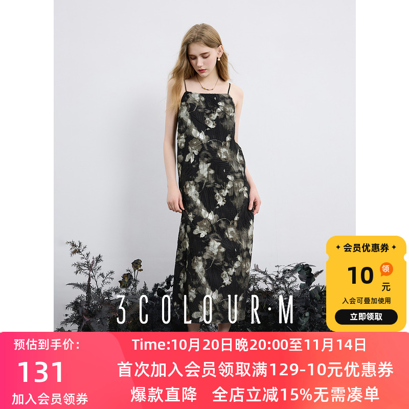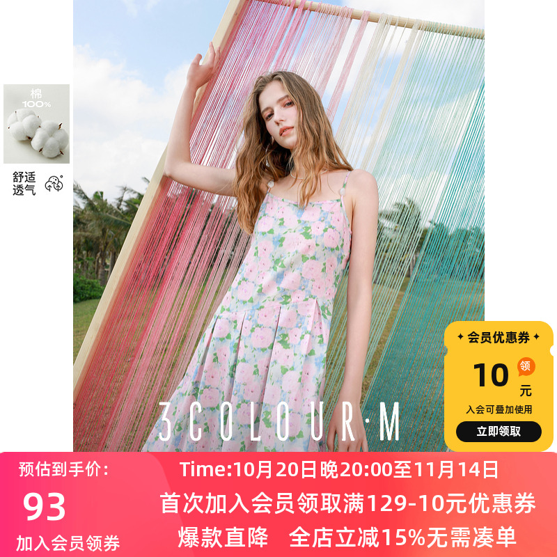三彩2025夏季新款碎花吊带裙无袖高腰连衣裙显瘦A字裙长裙度假M