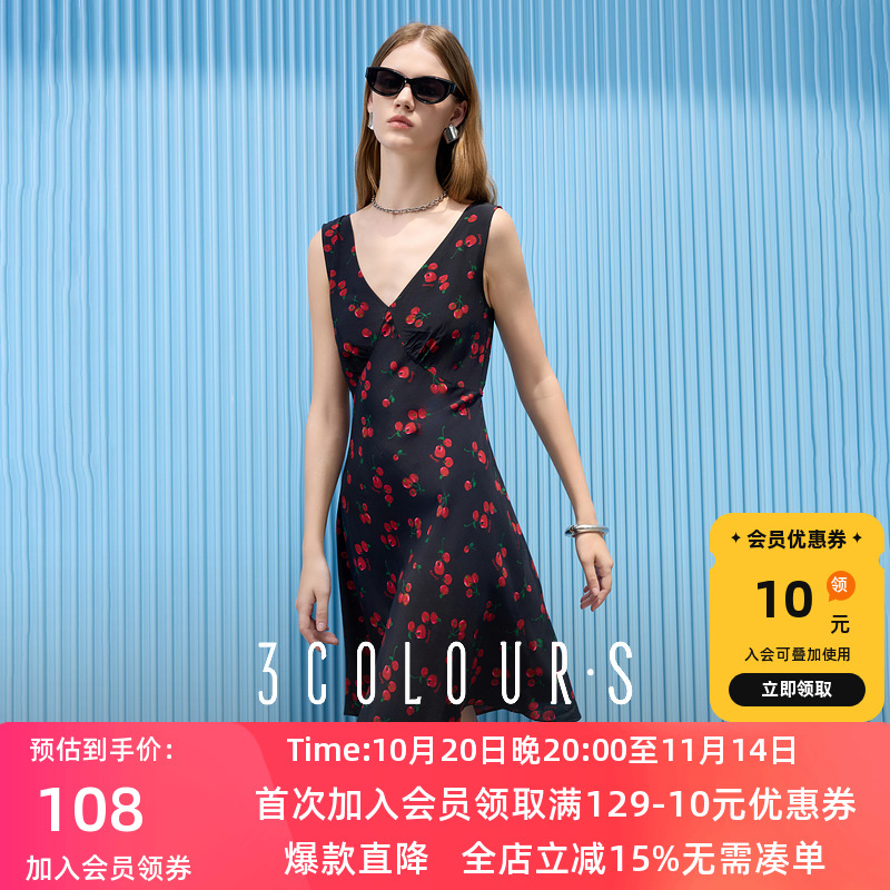 三彩2025夏季新款樱桃连衣裙V领收腰A字裙无袖短裙复古优雅S