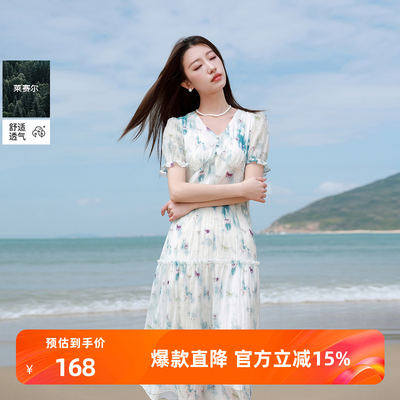 三彩2025夏季新款法式莱赛尔印花V领连衣裙泡泡袖长裙大摆度假S