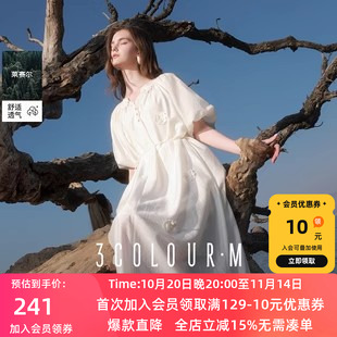 三彩2025夏季新款莱赛尔连衣裙立体花朵长裙灯笼袖浪漫度假M