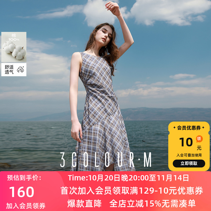 三彩2025夏季新款格纹连衣裙不对称A字裙系带解构长裙复古M