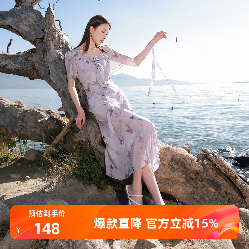 若潮大码女装2025夏季新款方领连衣裙蝴蝶印花荷叶边长裙胖MM