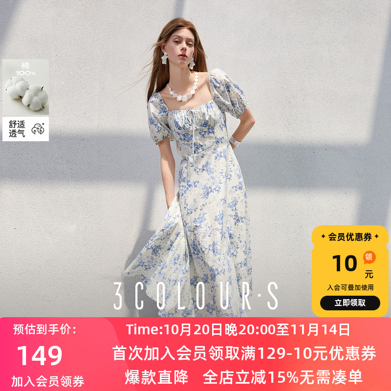 三彩2025夏季新款碎花连衣裙法式方领收腰A字裙泡泡袖长裙优雅S