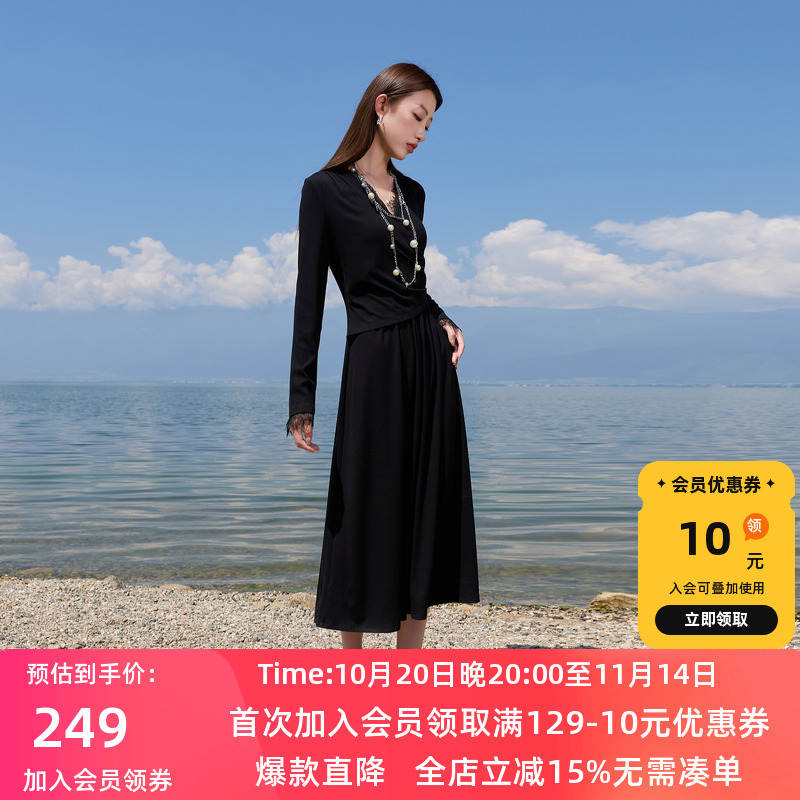三彩2025冬季新款蕾丝V领长袖收腰连衣裙A字裙长裙气质简约S