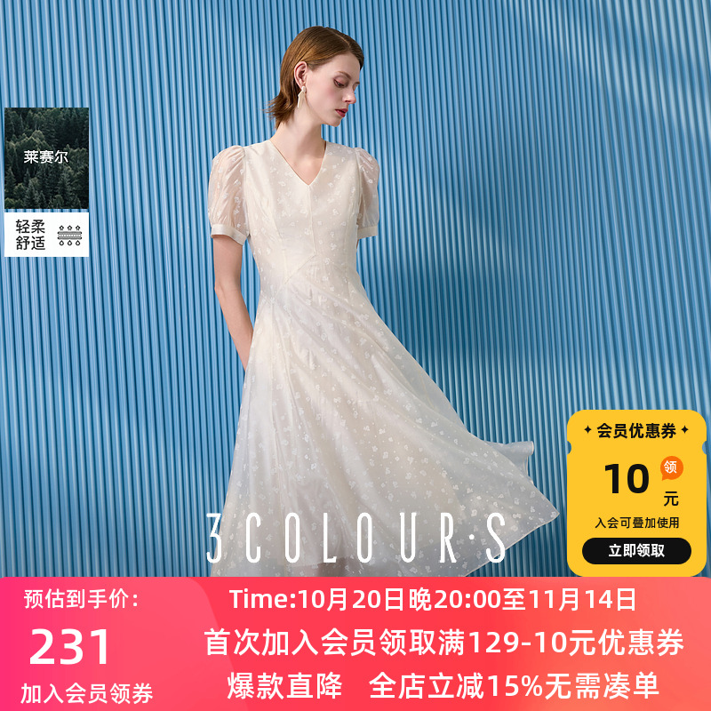 三彩2025夏季新款莱赛尔连衣裙法式V领收腰A字裙泡泡袖长裙S
