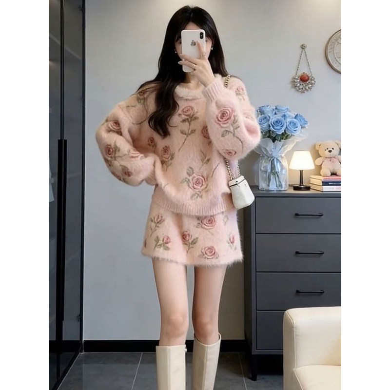 韩式温柔千金风玫瑰毛绒软糯针织套头毛衣衫搭配包臀短裙两件套装