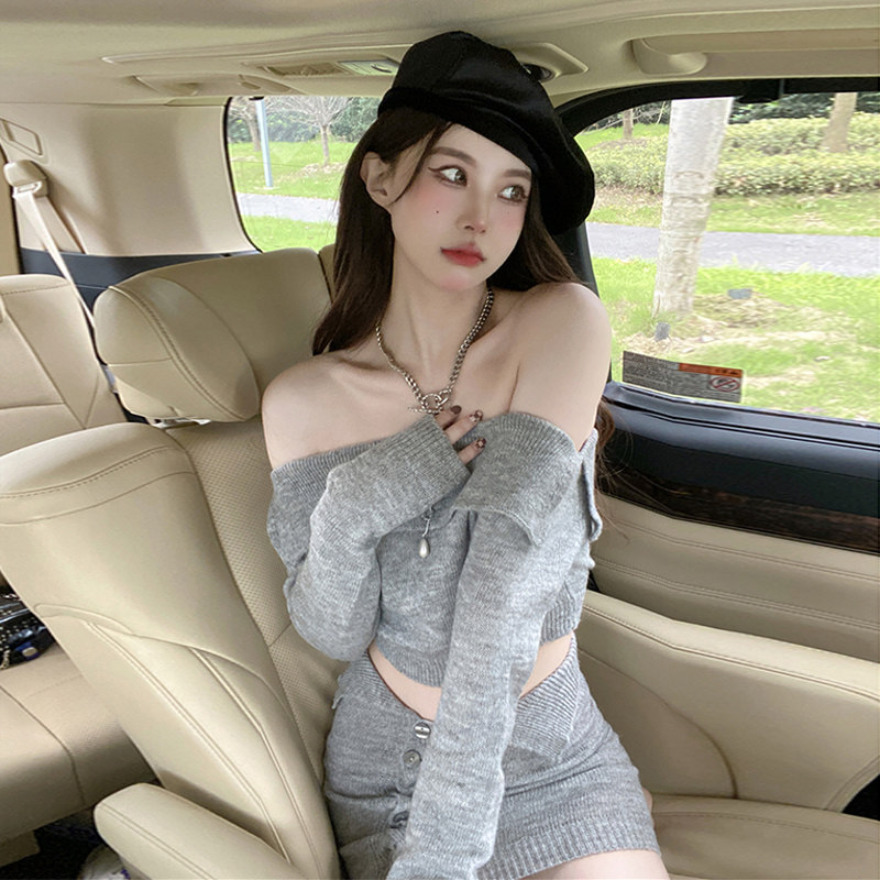 一字肩毛衣高级包臀裙辣妹独特漂亮两件套性感纯欲针织套装女秋冬