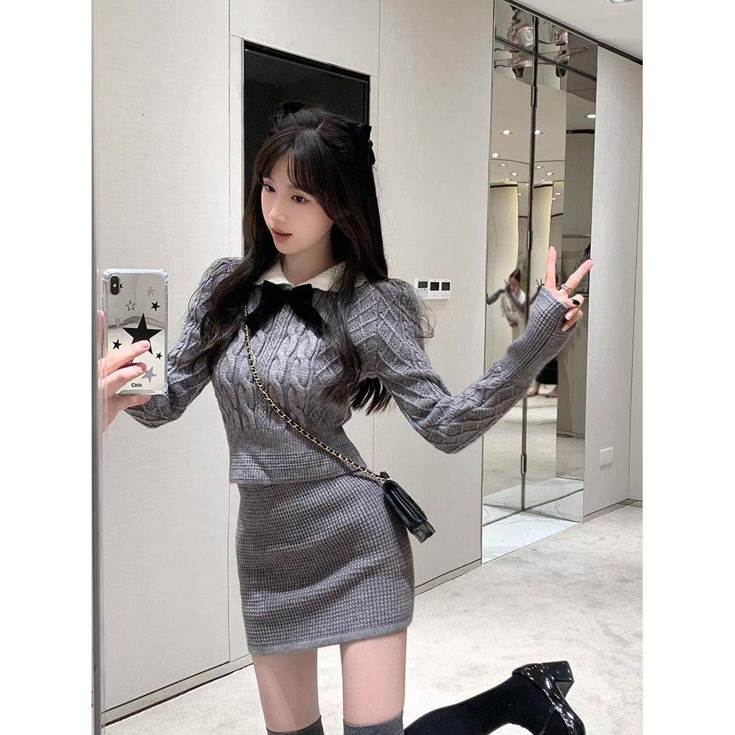 小香风灰色针织毛衣套装女秋冬学院风千金名媛包臀半身裙子两件套