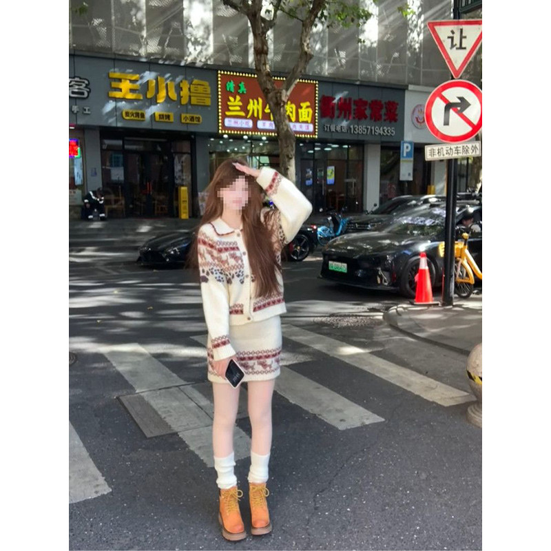 秋冬几何图案毛衣套装裙2025新款气质针织衫高腰包臀短裙两件套