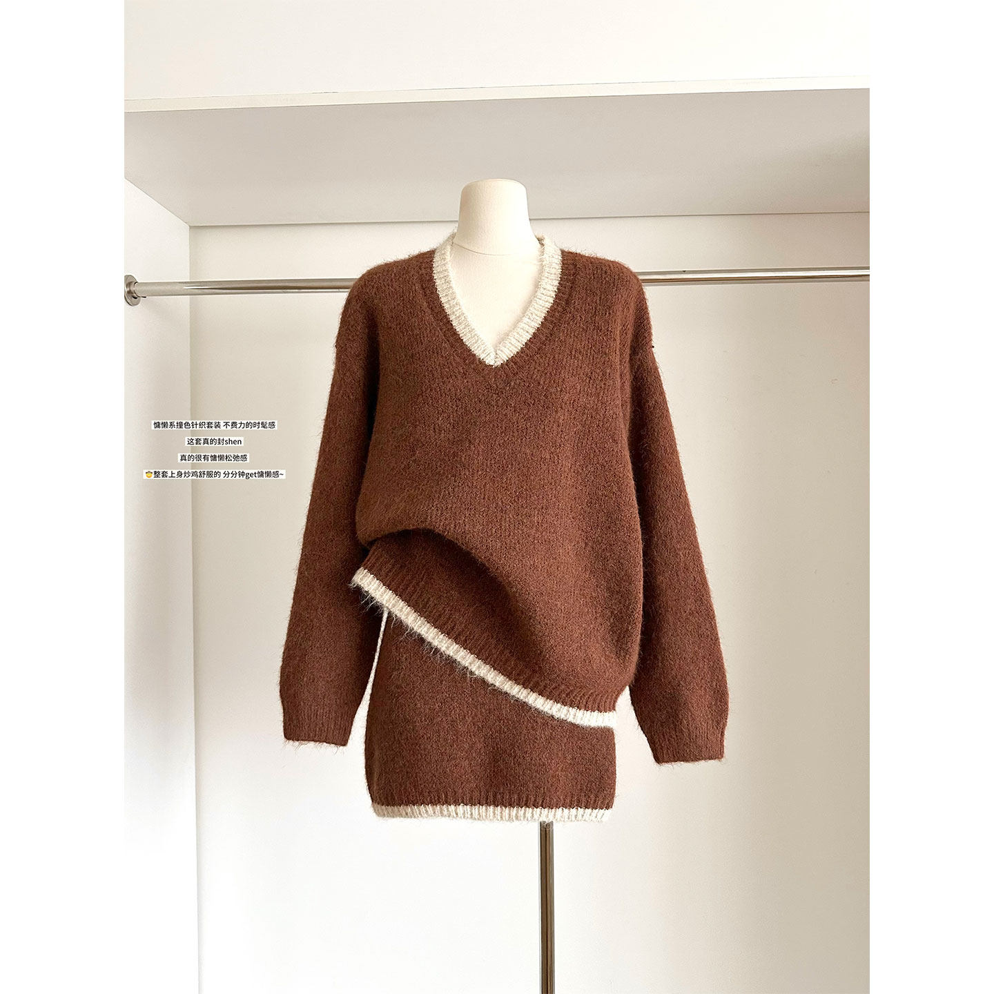 巨好看冬装套装韩系秋冬季慵懒风v领毛衣女+针织包臀半身裙两件套