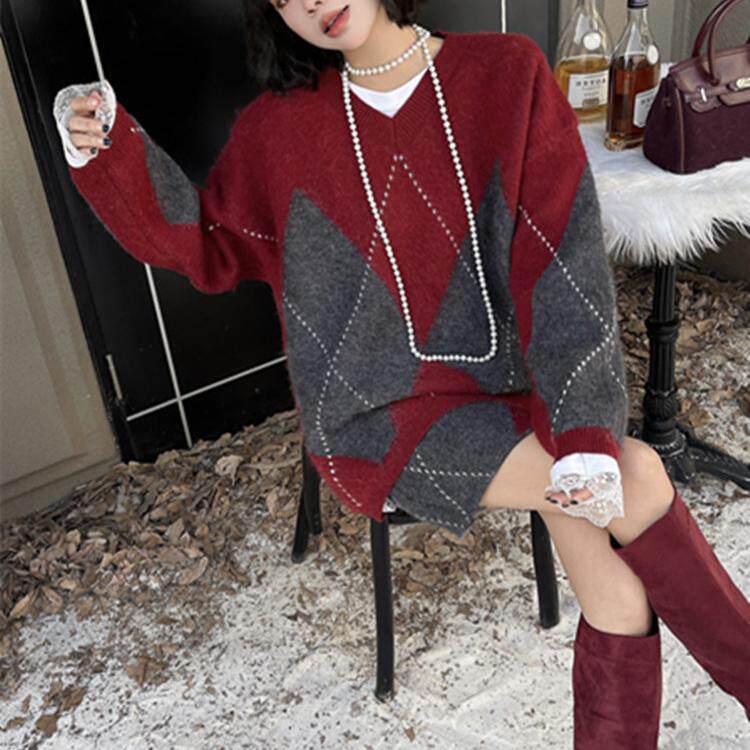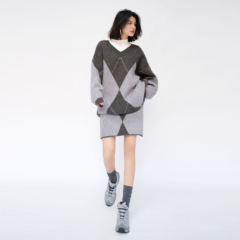 OF U高级感菱形格毛衣套装女秋冬新款撞色慵懒风针织包臀裙两件套