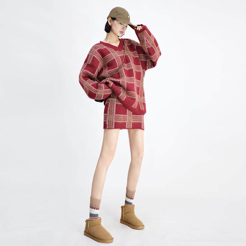 OF U新年氛围感红色格子毛衣套装女秋冬慵懒针织上衣包臀裙两件套