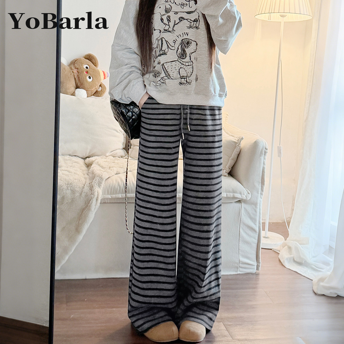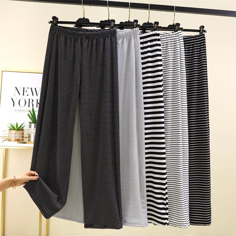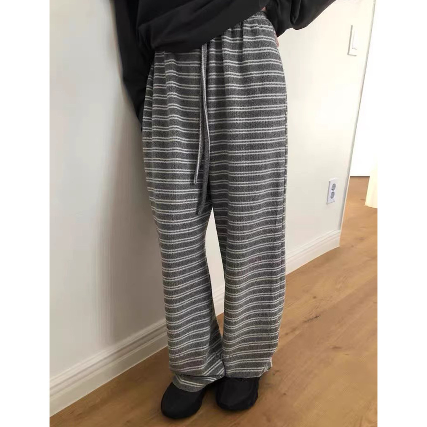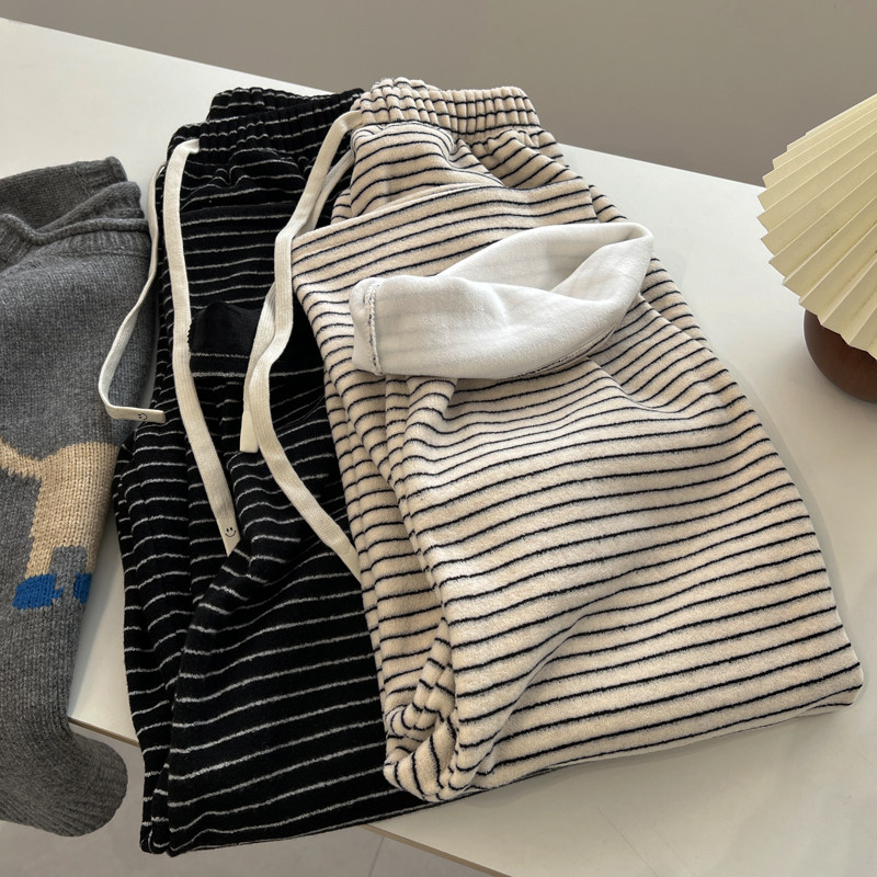 德绒黑白条纹休闲裤女秋冬高腰外穿长裤家居裤大码睡裤加绒阔腿裤