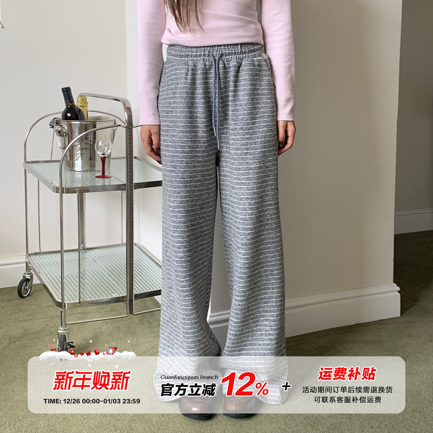 爆款时尚加绒加厚条纹休闲裤女装2025冬季宽松显瘦高腰抽绳阔腿裤