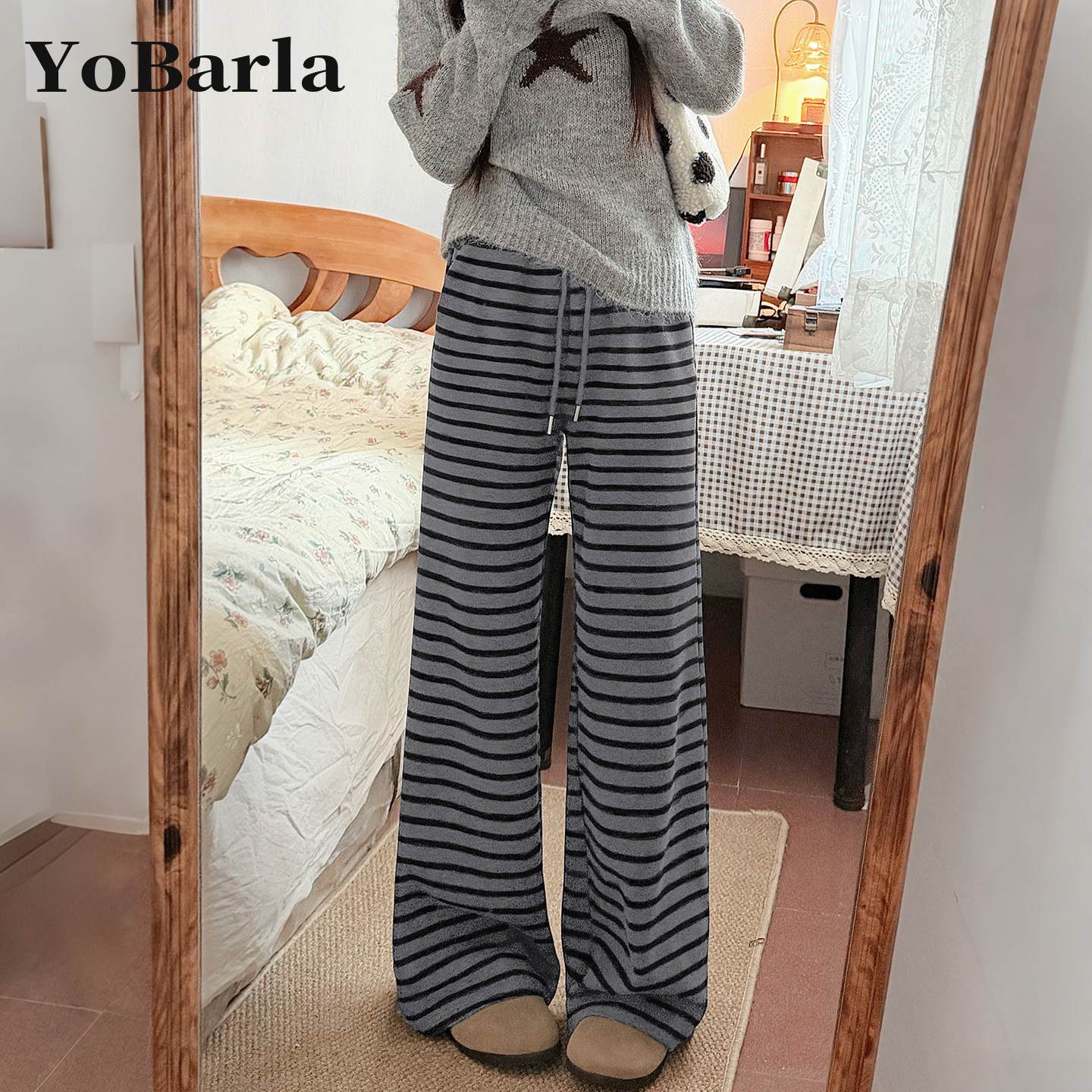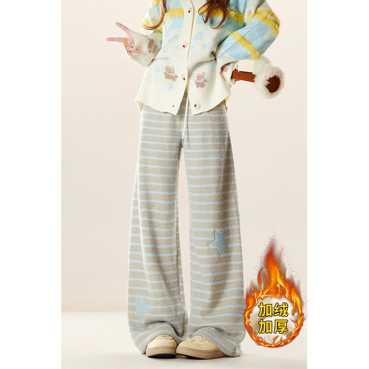 SIXI四喜家 挚爱懒懒裤 加绒加厚条纹休闲裤女秋冬保暖直筒阔腿裤