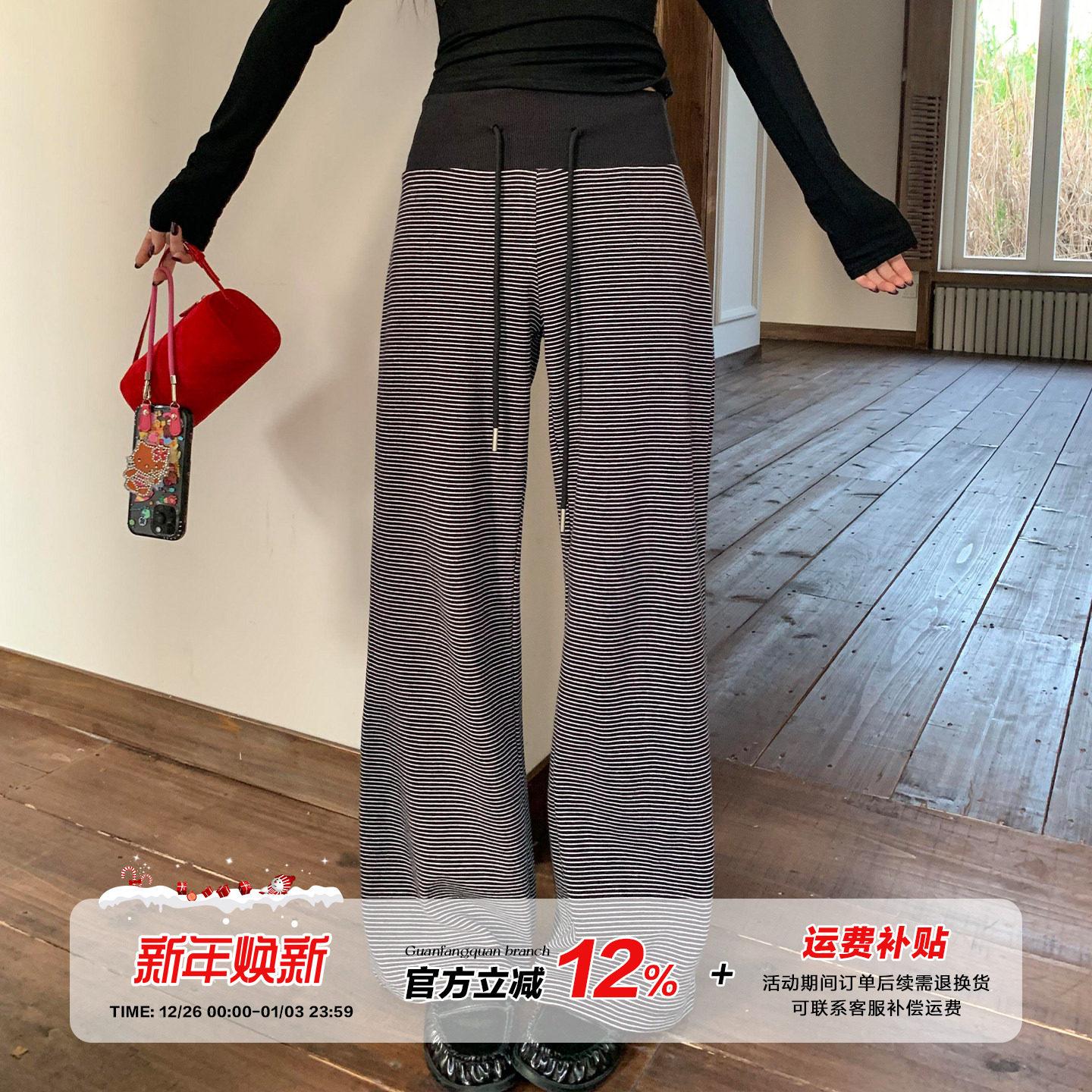 橘子树在哪儿韩系条纹休闲裤女秋季慵懒风垂感直筒抽绳松紧腰卫裤